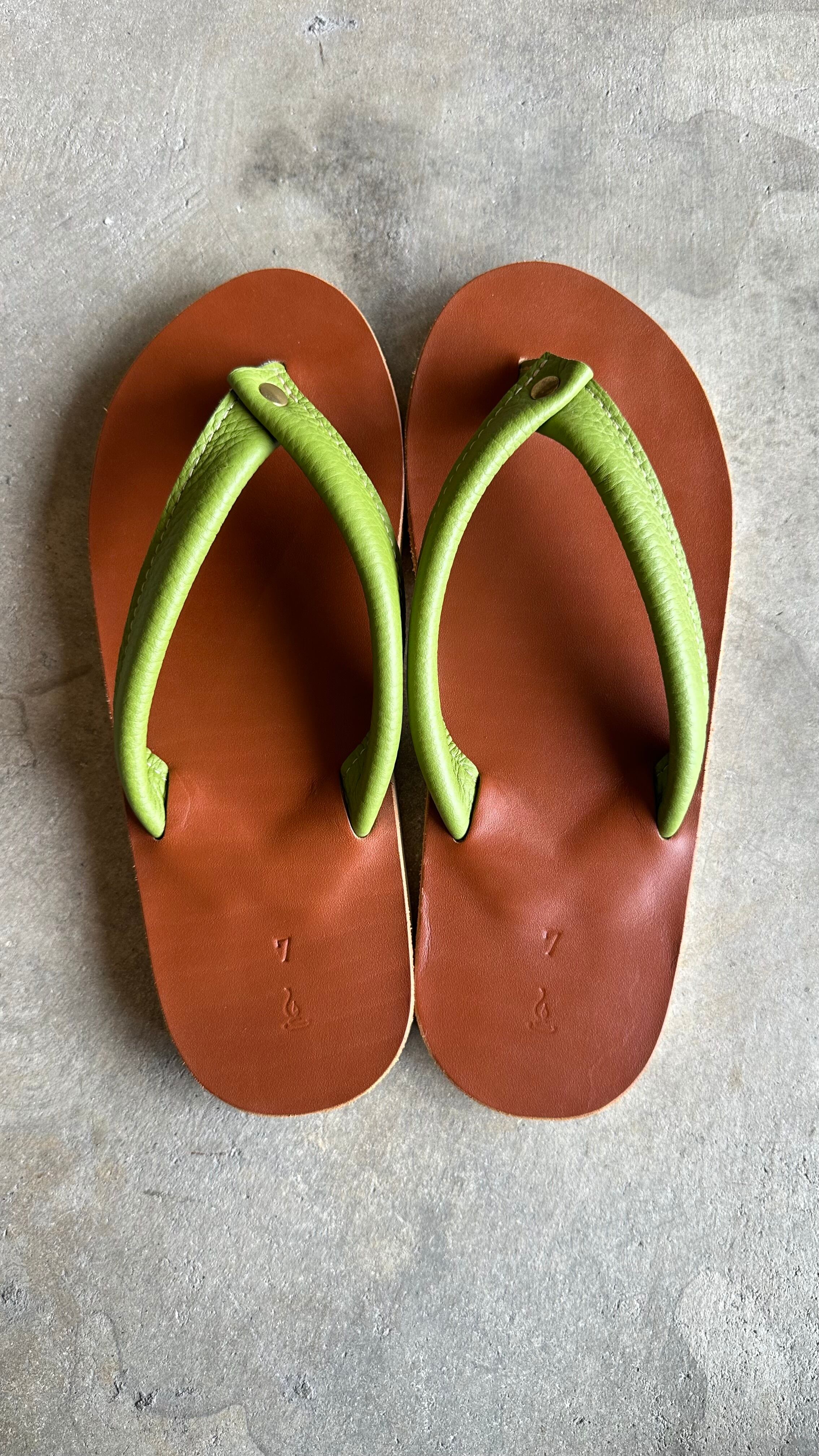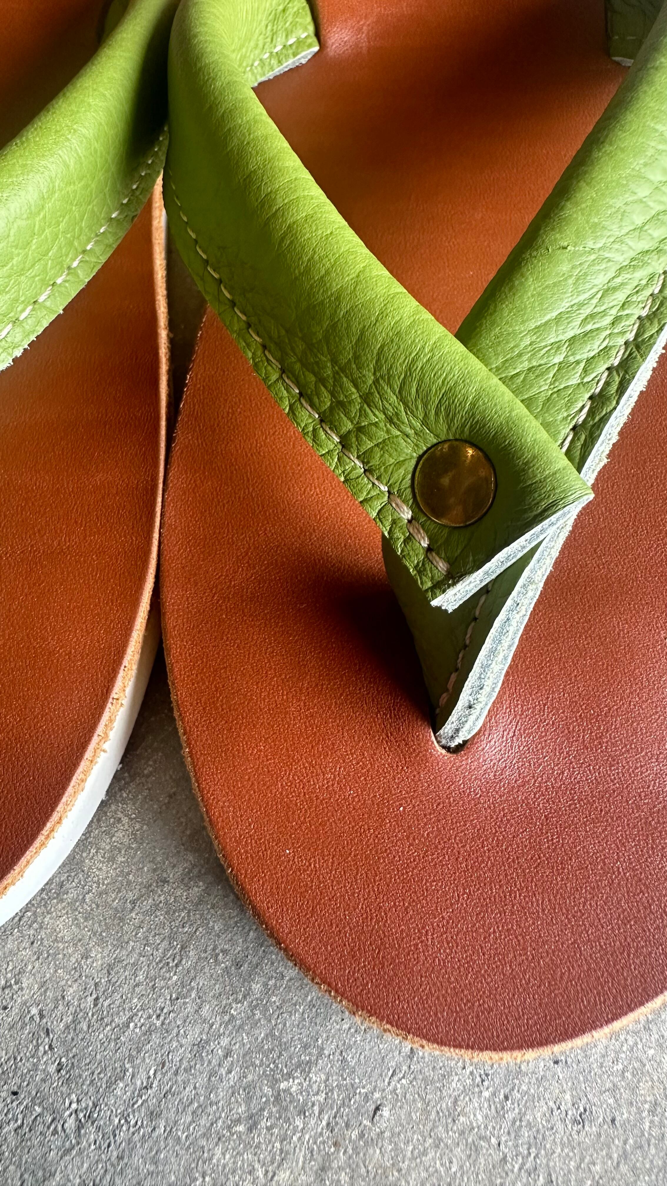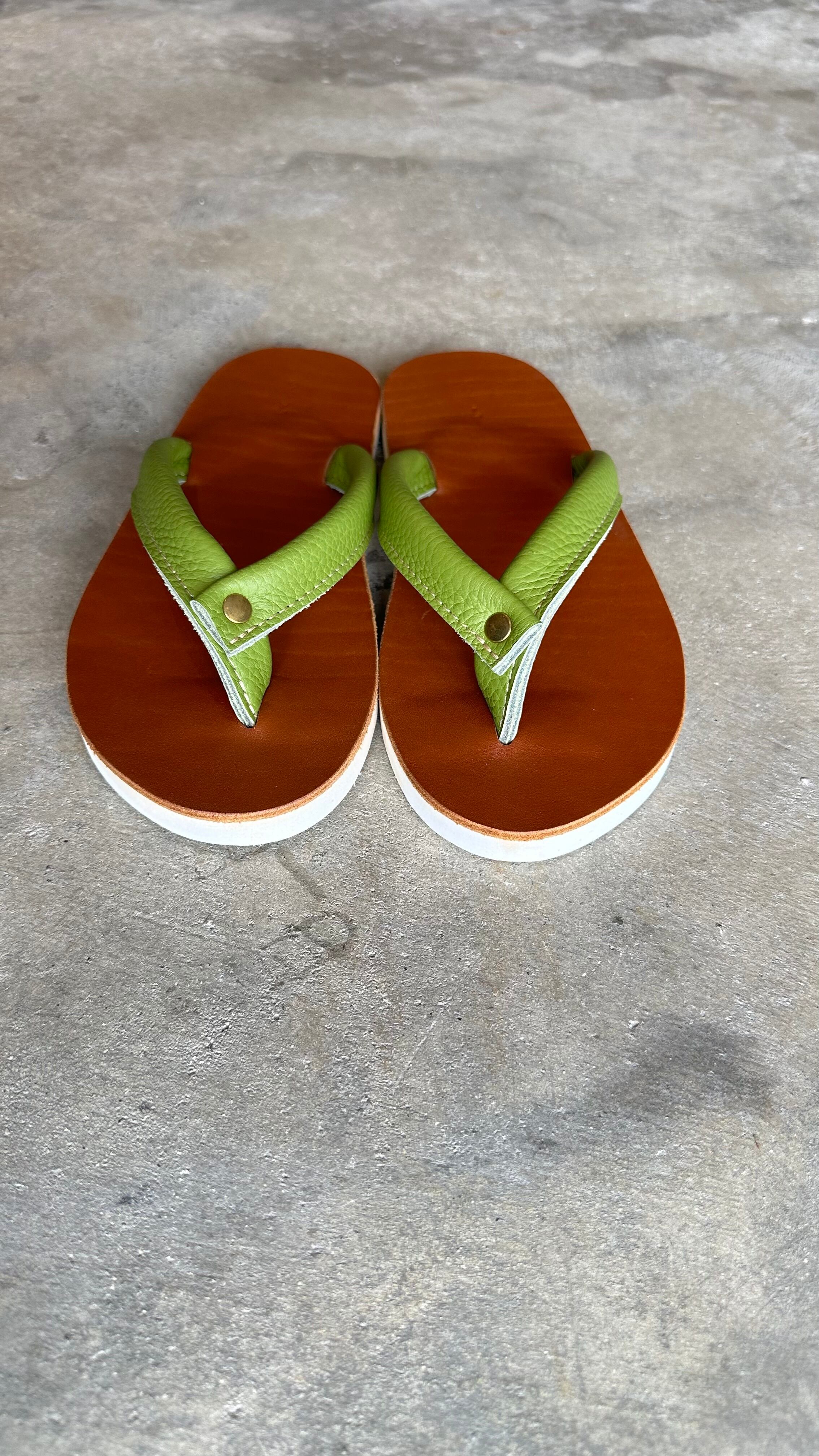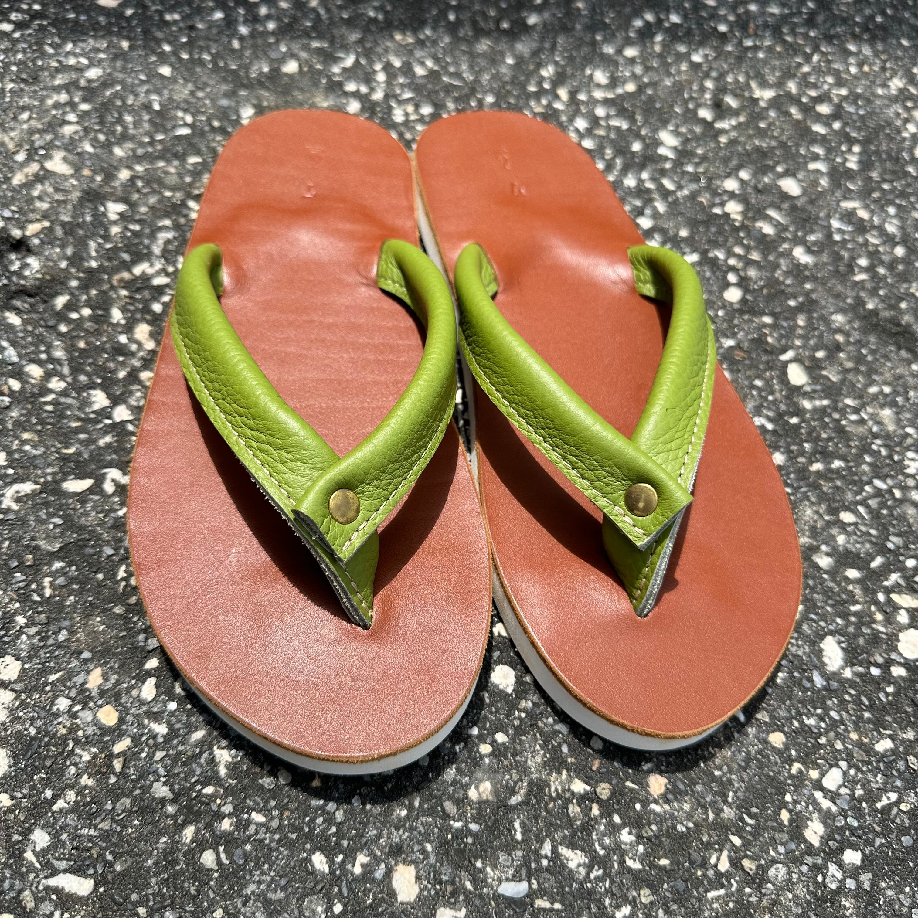 鼻緒を黄緑の単色で革ソールはブラウンを使用しております。ゴムソールはホワイトです。