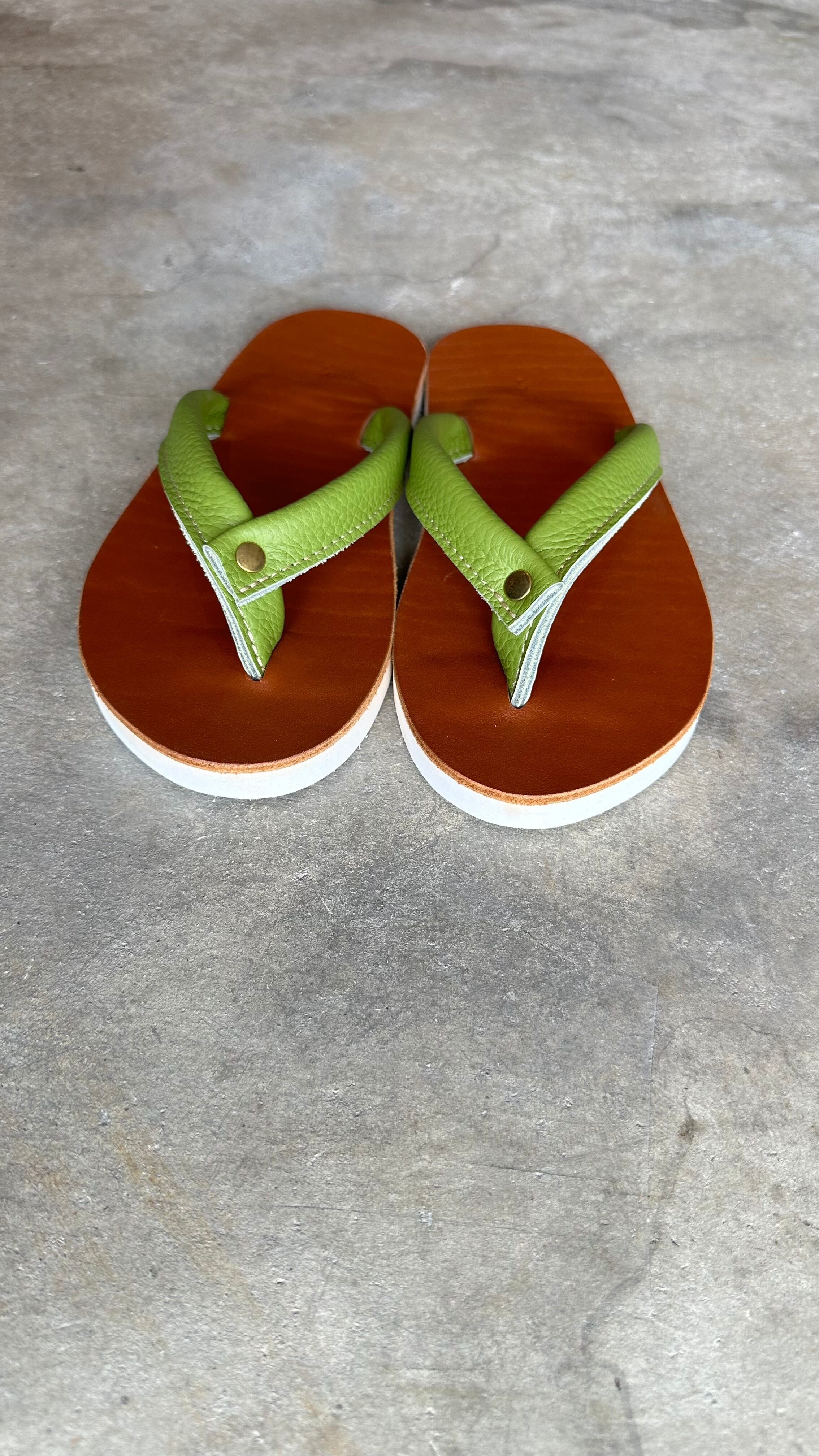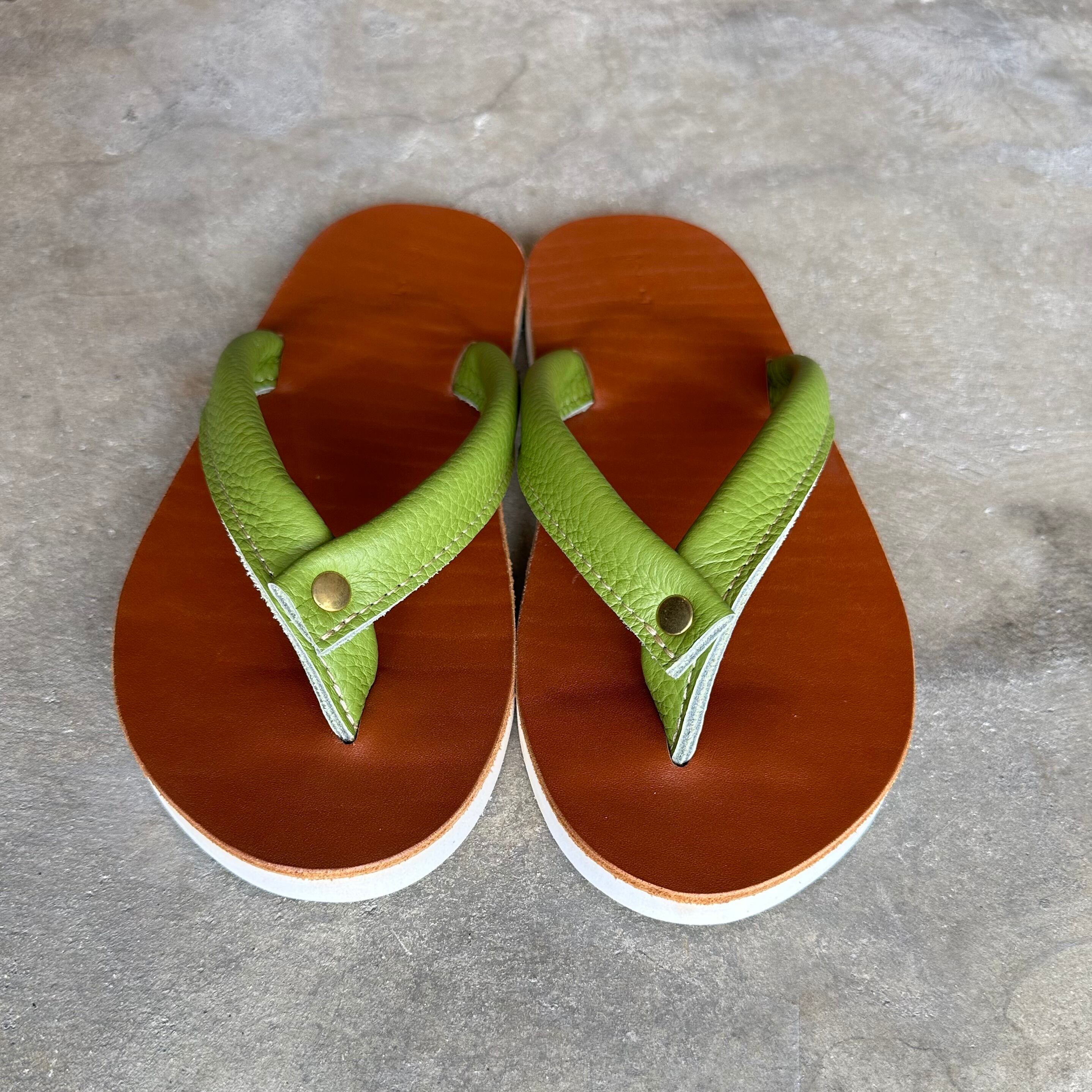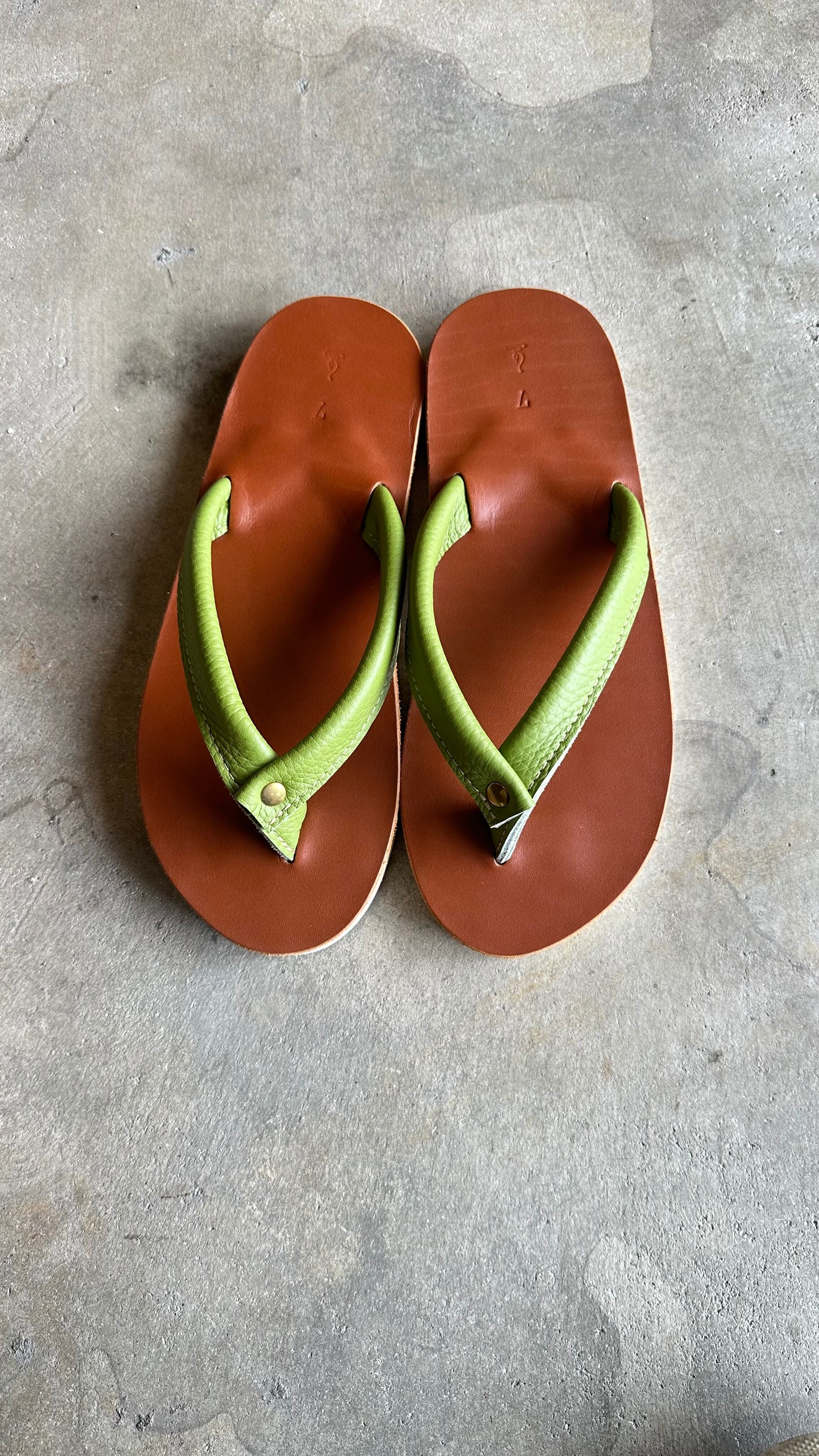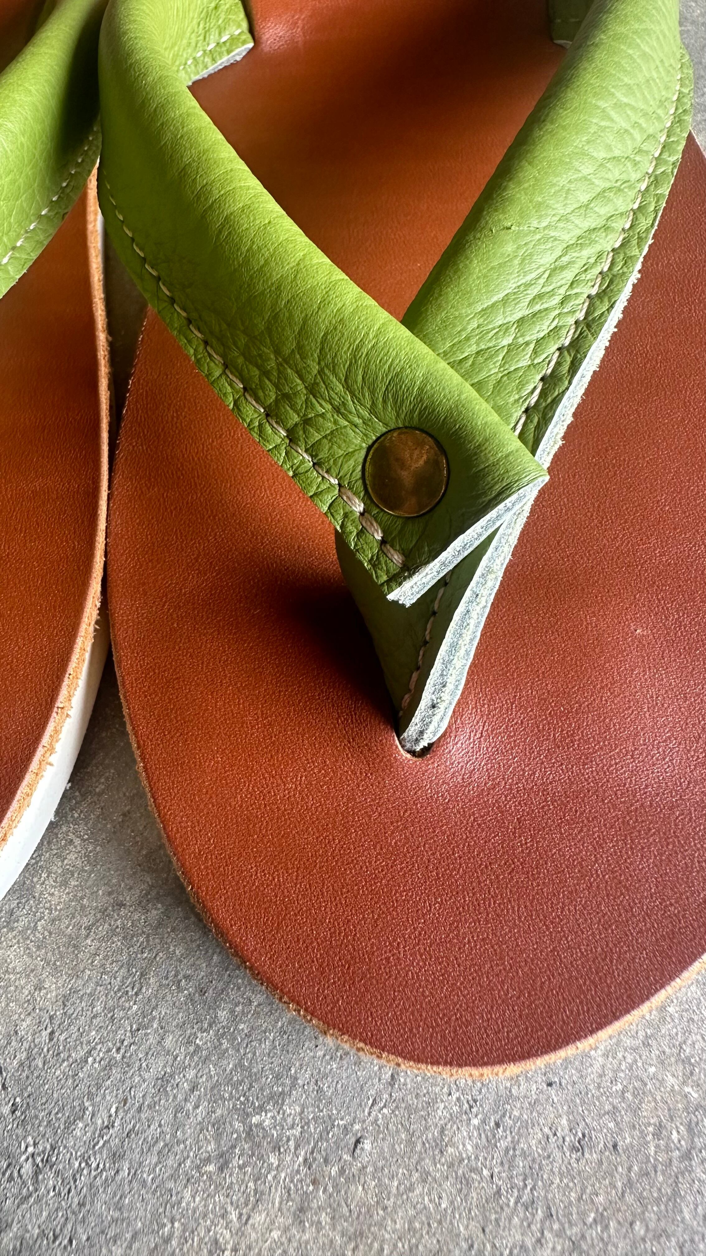 鼻緒を黄緑の単色で革ソールはブラウンを使用しております。ゴムソールはホワイトです。